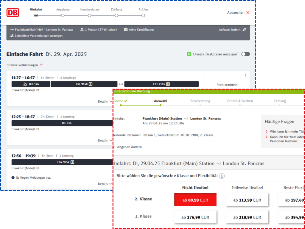 In diesem Buchungsbeispiel sieht man, dass man bereits ab 88,99 € von Frankfurt ins Zentrum von London reisen kann. Dies ist in etwa 6 Stunden und 30 Minuten möglich.